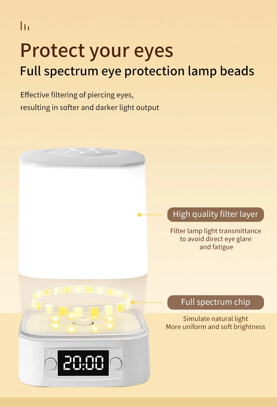 Rechargeable LED Table Lamp with Clock – soft and soothing light ideal for bedside use, bedrooms, or décor purposes. Features touch control, adjustable brightness, and clock display, combining functionality and style.